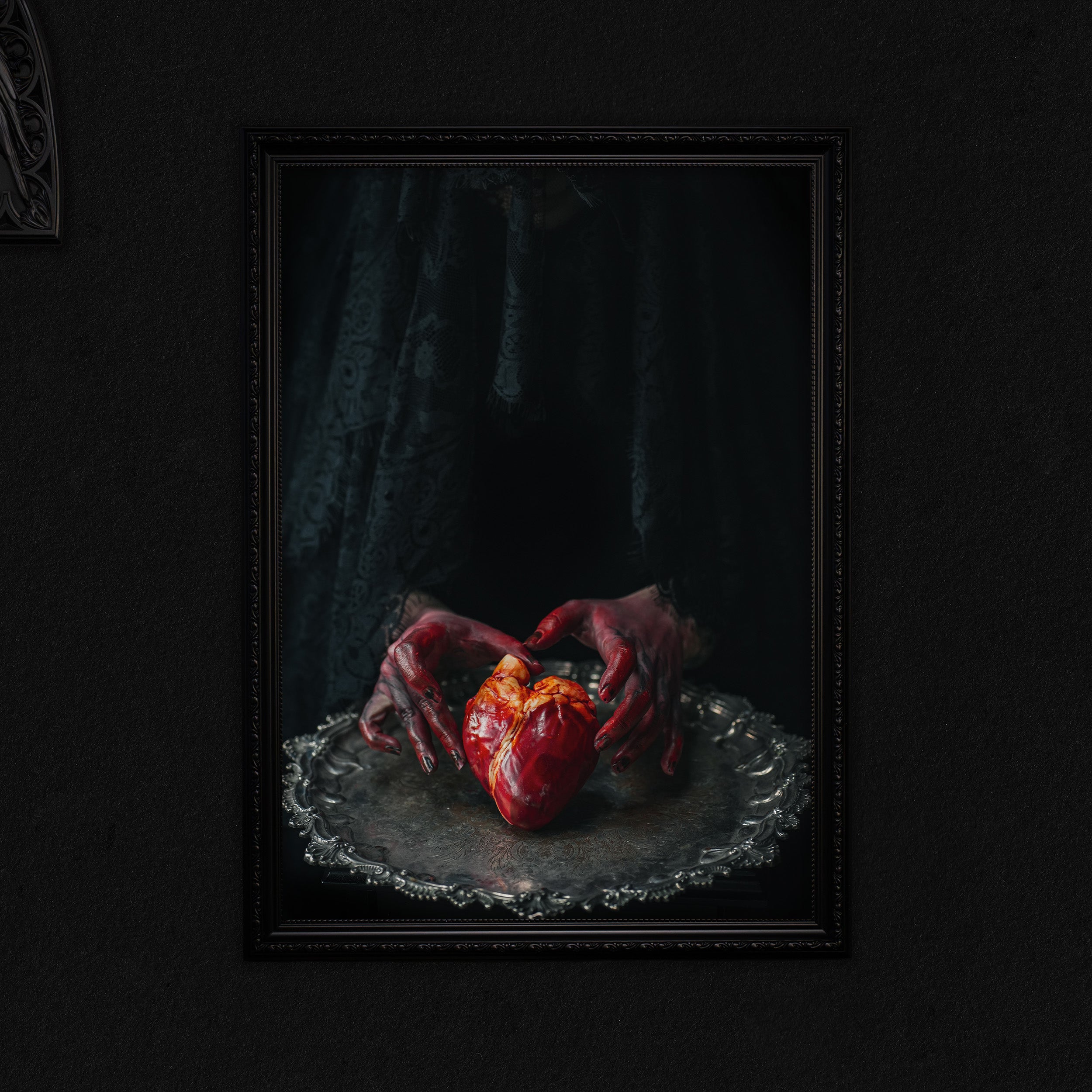'The Heart She Offered' is a powerful and visceral photographic print that explores the raw vulnerability of love and sacrifice. At its centre, a lifelike human heart, bloody and glistening whilst cradled in the outstretched hands of a veiled woman draped in black lace. Her face remains hidden, her identity cloaked in mystery, allowing the gesture itself to speak: an offering of the heart, unguarded and unfiltered.