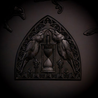 Every element is intentional: the ravens, long considered harbingers of death and messengers between worlds, face each other across a lit candlestick - a flame that cannot last. They rest upon a sand timer, the classic emblem of time slipping away, grain by grain. Together, these symbols speak in quiet chorus of the impermanence of life, the inevitability of death, and the tension between the two.